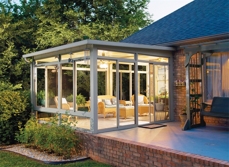 阳光房最重要的还是需考虑它的保温性能,由于阳光房是断桥铝+玻璃组成,因此采光性能肯定是相对较好的,如果保温节能做得不好的话那么阳光房就秒变桑拿房了,而且在里面加装空调电费也会非常高相当不节能。因此节能保温设计的重心就要在型材以及玻璃组成方面上下功夫了,玻璃不妨选择中空LOW-E玻璃,能够最大限度隔绝热量传递。