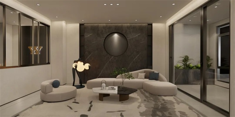 在客厅情景空间中,低饱和度的浅色基调、流畅的弧形沙发、绿植与摆件的点缀,共同勾勒出隐奢美学的柔和质感。