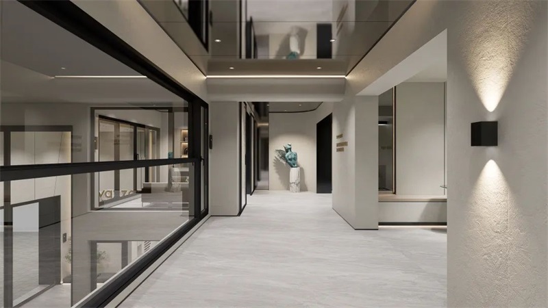 美学馆内,挑空结构赋予空间通透感,5米超高的瓦瑟「25电动全景推拉门」,25mm极窄中挺和嵌入式门扇设计,实现震撼的全景视野。一开一合间,室内外界限悄然消融,磁悬浮电控系统搭载摩根智能的精准响应,让科技与美学浑然一体。