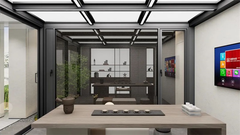 拥抱更大的世界,窗见更美的四季,阳光房绝对是其中翘楚,打造系统产品与空间融合的沉浸氛围。穿过瓦瑟「133 LSD提升推拉门」,原木色桌椅散发着自然的气息,茶具整齐摆放,氤氲着袅袅茶香,疲惫瞬间消散,只余内心的宁静与惬意。