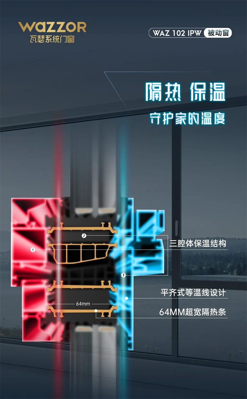 The 64mm ultra-wide thermal break strip is more than twice the size of the conventional thermal break strip, and its thermal insulation effect far exceeds that of similar products. Wazzor 102IPW passive window, designed for extreme climates, is equipped with a 64mm German Tylenow ultra-wide thermal insulation strip, with a K value of less than 0.79. It features passive near-zero energy consumption and builds a green building that maintains a constant temperature and saves energy.