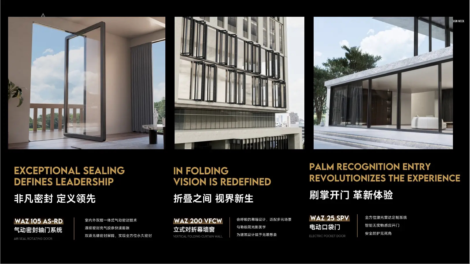 WAZ200VFCW立式对折幕墙窗,会呼吸的幕墙设计适配多元场景,勾勒出极简光影美学,为建筑设计赋予无限想象,让空间更具艺术感。WAZ25SPV电动口袋门,配备全方位激光雷达定制系统,智能无实物感应开门,安全防护无死角,开启便捷安全生活新方式。瓦瑟系统门窗,以创新科技与卓越设计,引领门窗行业新潮流。