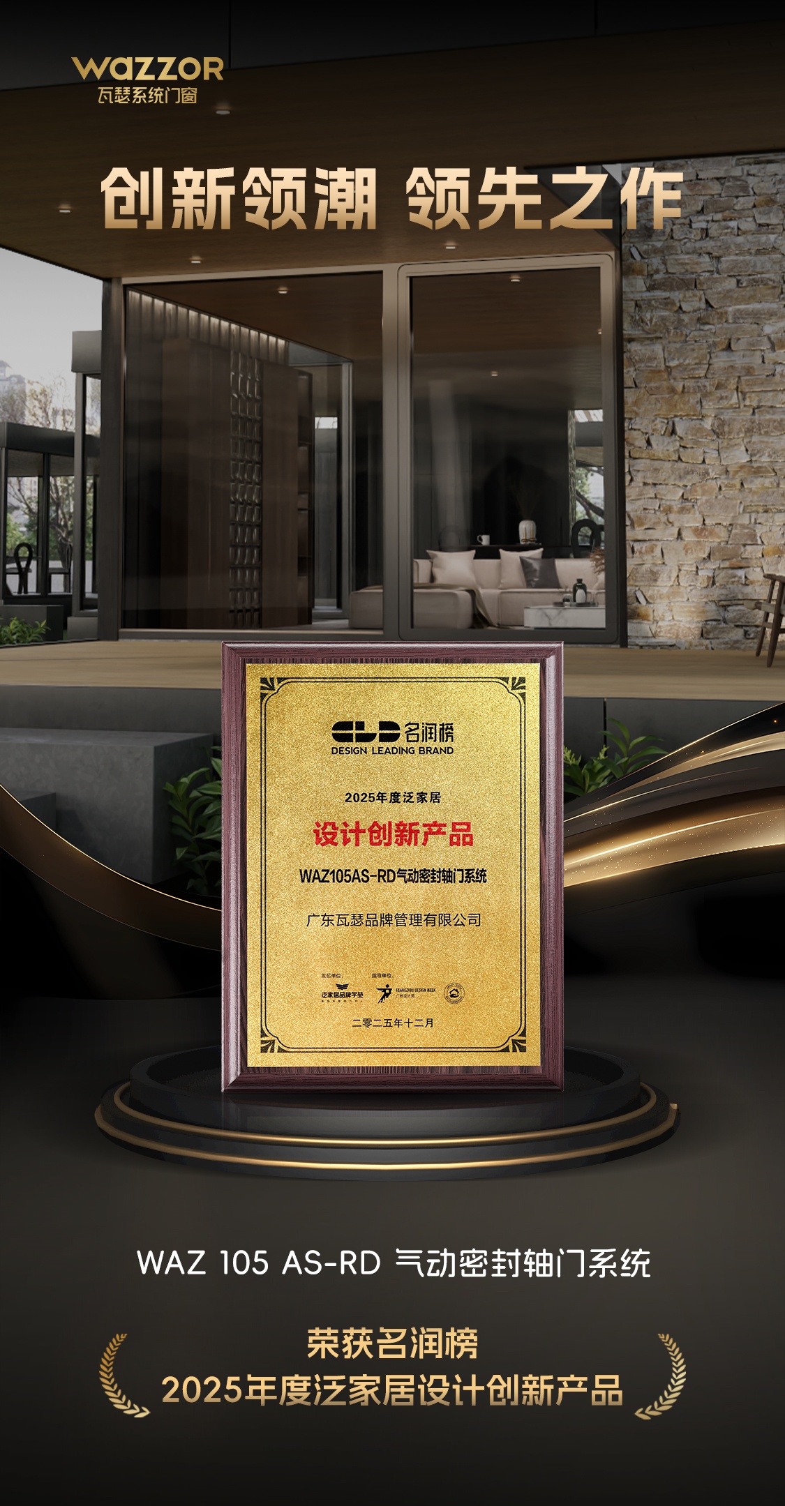 此次荣获名润榜2025年度泛家居设计创新产品,是对瓦瑟系统门窗WAZ105AS-RD气动密封轴门系统的高度认可。未来,瓦瑟系统门窗将继续秉持创新理念,不断探索前行,以更多优质、创新的产品,为消费者打造更美好的家居生活。